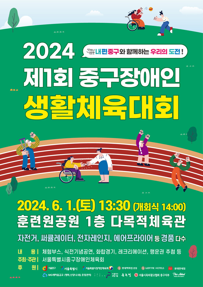 [시민일보 = 여영준 기자] 중구가 오는 6월1일 오후 2시 훈련원공원 종합체육관에서 ‘제1회 장애인생활체육대회’를 개최한다.