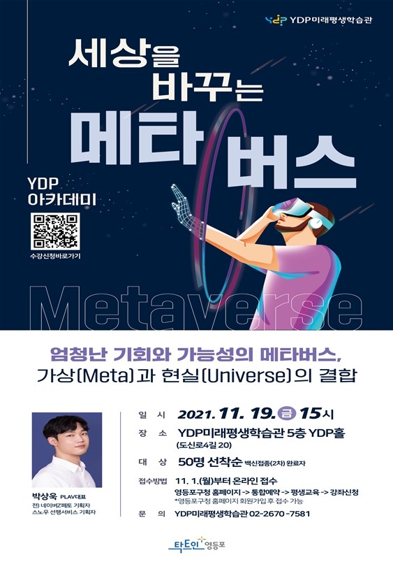 [시민일보 = 여영준 기자] 영등포구(구청장 채현일)는 YDP아카데미의 프로그램 중 하나인 ‘세상을 바꾸는 메타버스’ 특강을 오는 19일 개최하고 특강에 참여할 수강생을 선착순 모집한다고 9일 밝혔다.