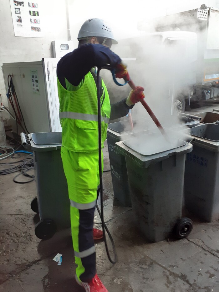 | ▲ 수거된 RFID 종량기들이 자원순환공원에서 고온 스팀으로 세척되고 있다(사진=송파구청 제공) |