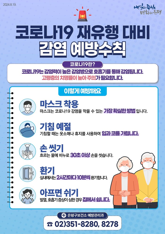 김미경 구청장은 “여름철 에어컨 사용으로 인한 실내 환기 부족과 휴가철 사람 간 접촉 증가 등으로 호흡기 감염병 유행 위험이 높아지는 만큼 질병관리청에서 마련한 ‘코로나19 감염 예방 수칙’을 준수하길 당부드린다”고 말했다.