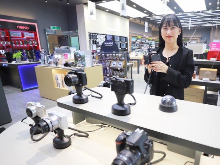 | ▲ 롯데하이마트 대치점에서 모델이 카메라를 살펴보는 모습. (사진=롯데하이마트 제공) |