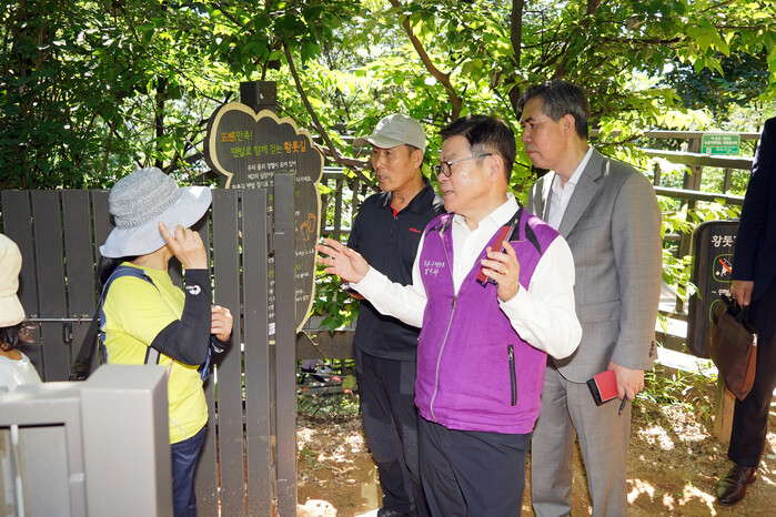 | ▲ 이필형 구청장이 배봉산 맨발황톳길에서 주민들로부터 민원을 청취하고 있다. (사진=동대문구청 제공) |