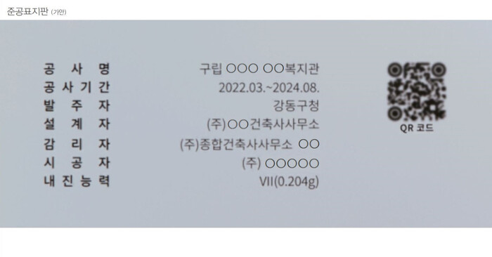구는 공공건축 사업의 투명성과 담당자의 책임성을 높이고 부실공사를 예방하기 위해, 준공표지판 내에 정보 무늬(QR코드)를 추가하는 방법으로 이를 도입하기로 했다고 12일 밝혔다.