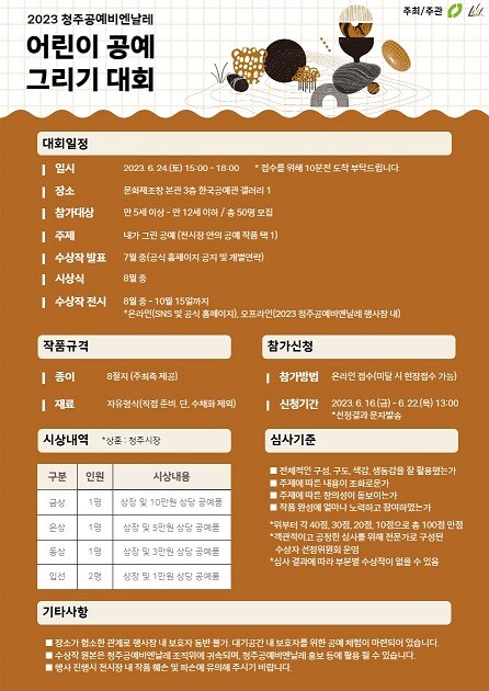 2023 청주공예비엔날레 사전행사인 이번 대회는 6월 한 달 토요일마다 진행 중인 ‘공예마르쉐’와 연계한 것으로, ‘내가 그린 공예’를 주제로 대회장인 전시공간 내 작품을 대상으로 삼아 그리면 된다.