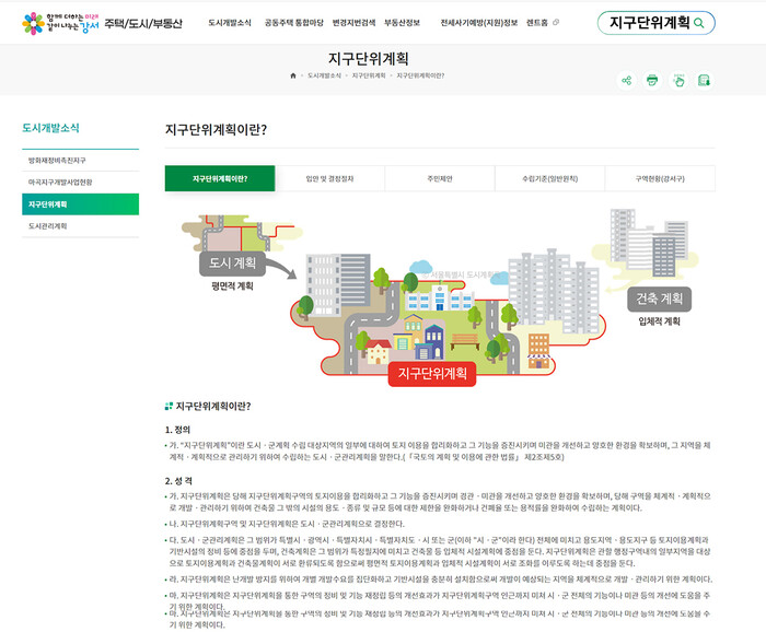 메뉴는 지구단위계획의 정의와 관련 법규를 알기 쉽게 정리하고 계획안 입안 절차를 상세히 소개했다.