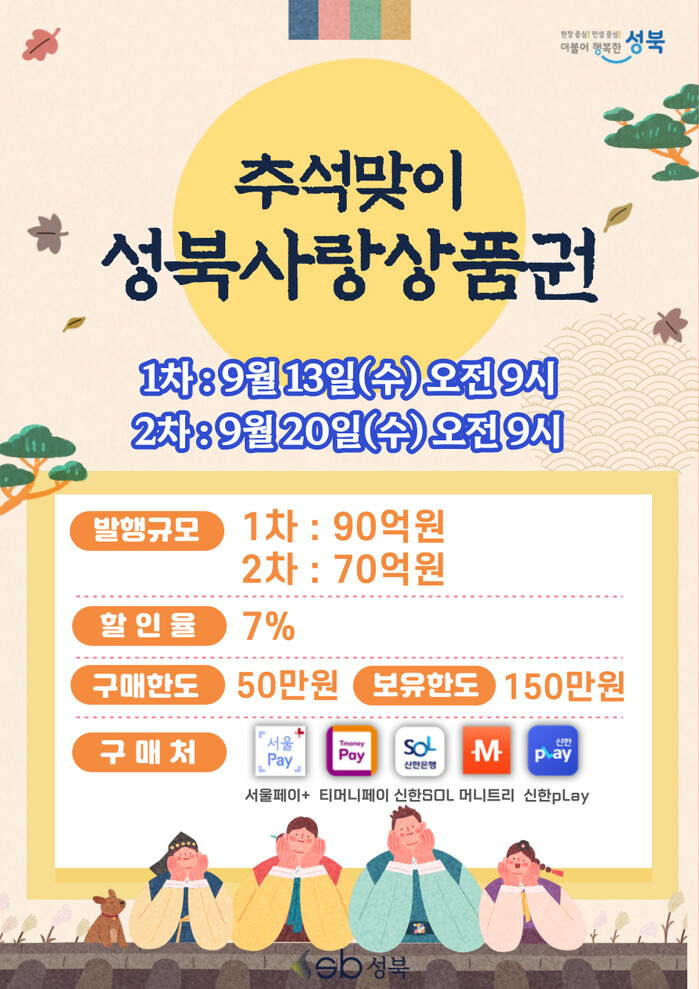 이승로 구청장은 "이번 추석을 맞아 지역 상권을 활성화하고 가계 부담을 줄이고자 성북사랑상품권 발행 규모를 늘렸다"라며 "성북사랑상품권과 함께 행복하고 풍성한 한가위를 보내길 바란다"라고 말했다.