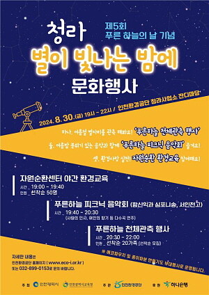 [인천=김형만 기자] 인천시와 인천환경공단이 8월 30일 서구 청라사업소 잔디마당에서 ‘청라 별이 빛나는 밤에’ 문화행사를 개최한다.
