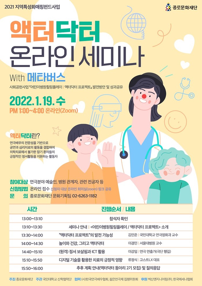 [시민일보 = 이대우 기자] 서울 종로구가 19일 ‘액터닥터 프로젝트’의 성과를 공유하고 발전 방안을 모색하기 위해 ‘액터닥터 온라인 세미나’를 개최한다.