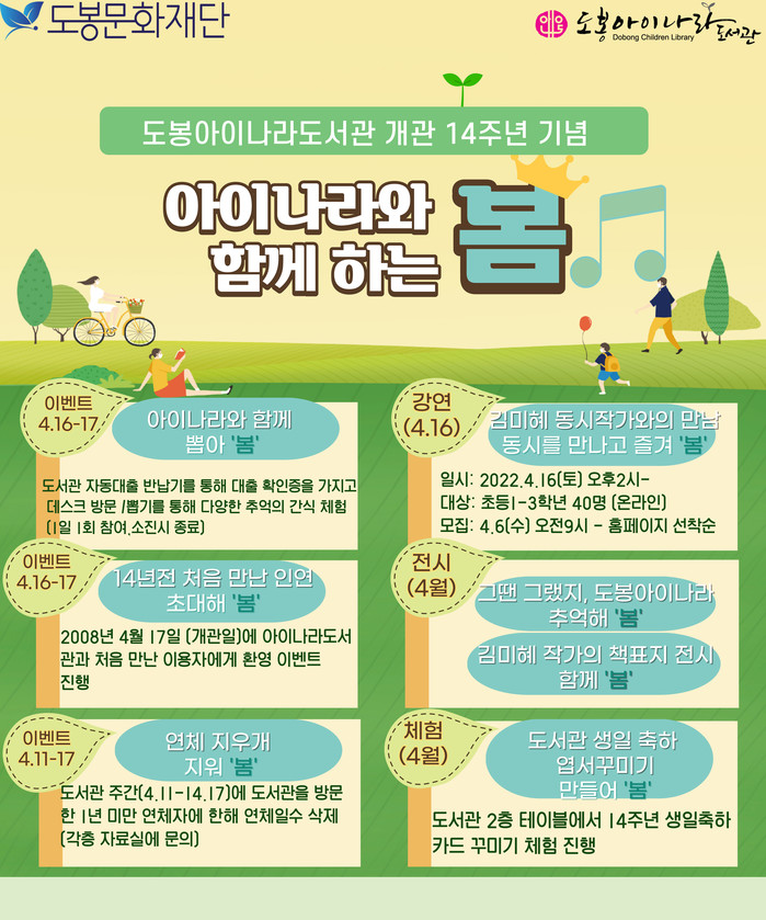 구는 본 행사를 통해 4월 한 달간 ▲아이나라와 함께 뽑아 ‘봄’ ▲14년 전 처음 만난 인연 초대해 ‘봄’ ▲연체 지우개 지워 ‘봄’ ▲김미혜 동시작가와의 만남 동시를 만나고 즐겨 ‘봄’ ▲그땐 그랬지, 도봉아이나라 추억해 ‘봄’ ▲김미혜 작가의 책표지 전시 함께 ‘봄’ ▲도서관 생일 축하 엽서꾸미기 만들어 ‘봄’ 등이 진행된다고 11일 밝혔다.