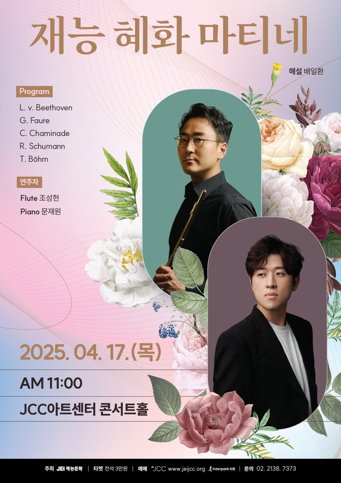 [시민일보 = 여영준 기자] 재능문화가 플루티스트 조성현, 피아니스트 문재원의 재능 혜화 마티네 공연을 JCC 아트센터 콘서트홀에서 오는 17일에 개최한다고 밝혔다.