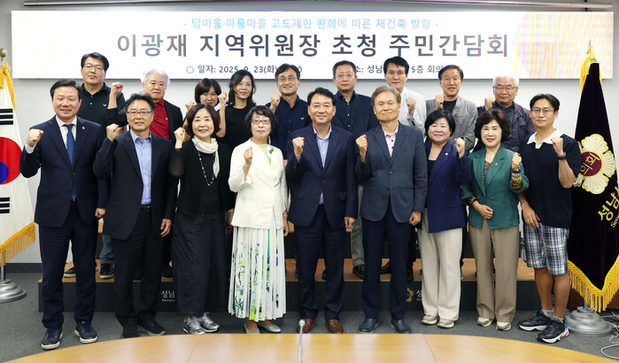 [성남=오왕석 기자] 성남시의회 더불어민주당협의회는 23일 성남시의회 5층 회의실에서 이광재 분당갑 지역위원장을 초청해 탑마을·아름마을 주민간담회를 개최했다. 이번 간담회에서는 최근 결정된 서울공항 고도제한 완화의 구체적인 내용과 이에 따른 재건축 추진 방향에 대해 주민들이 직접 설명을 듣고 의견을 나누는 자리가 마련되었다.