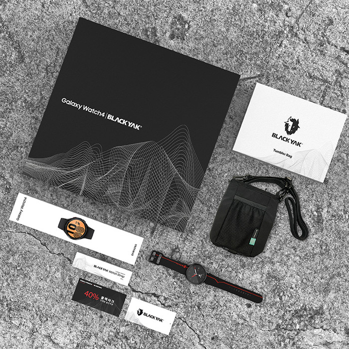 '갤럭시 워치4 블랙야크 패키지'는 ▲갤럭시 워치4 ▲블랙야크 전용 스트랩 ▲블랙야크 워치 페이스 ▲블랙야크 텀블러 가방 ▲블랙야크 40% 제품 할인권으로 구성됐다.