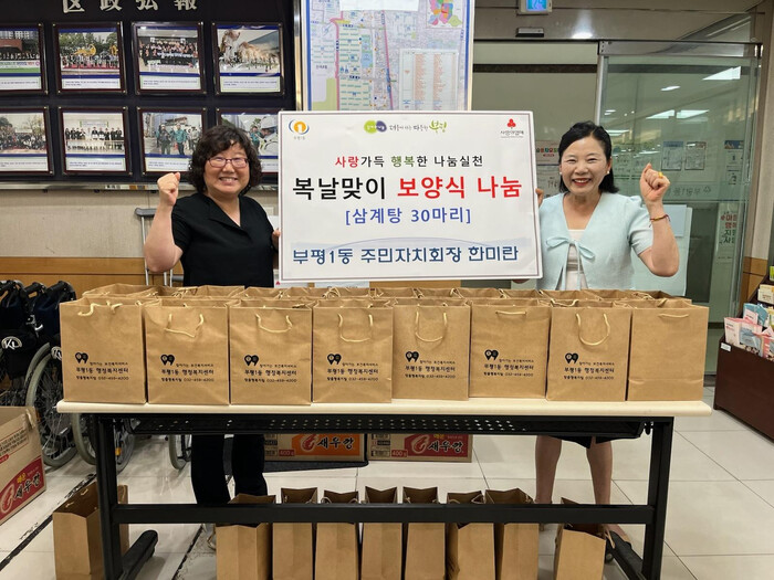 [인천=문찬식 기자] 인천 부평구(구청장 차준택) 부평1동은 24일 한미란 동 주민자치회장이 무더위 속 취약계층을 위한 삼계탕 30그릇(닭 30마리)을 기부했다고 밝혔다.