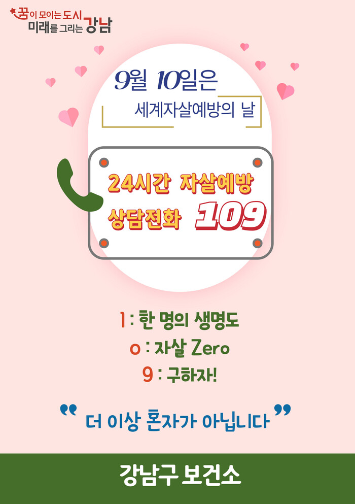 [시민일보 = 이대우 기자] 서울 강남구(구청장 조성명)가 세계 자살예방의 날(9월 10일)을 맞아 9월 한 달간 릴레이 캠페인을 개최하고 생명지킴이 돌봄 활동을 실시한다.