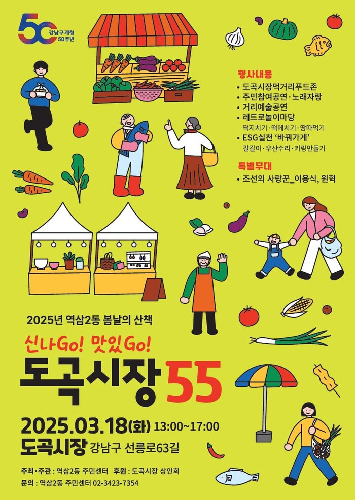 [시민일보 = 이대우 기자] 강남구(구청장 조성명) 역삼2동이 도곡시장 개장 55주년을 맞아 18일 ‘역삼2동 봄날의 산책, 신나Go! 맛있Go! 도곡시장55’를 개최한다.
