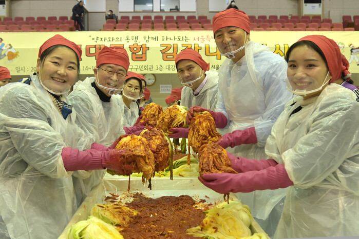 구에 따르면 테이블별로 ▲김치 버무리기 ▲김치 포장하기 ▲박스에 담아 옮기기 등 각자 역할을 맡아 일사불란하게 움직였다. 이따금씩 지칠 때면 노래에 맞춰 춤을 추거나 이날의 구호였던 ‘김치!’를 함께 외치며 힘을 돋우는 등 화합과 협력의 면모로 현장의 열기를 끌어올렸다.