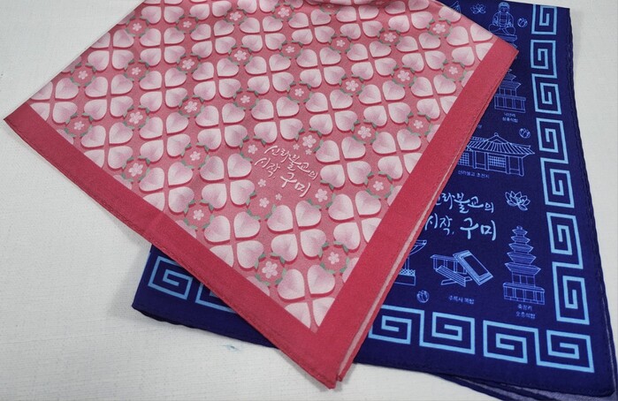 신라불교 문화 상징인 복숭아를 패턴화한 밝은 분홍색 스카프와 구미시 불교 문화재를 일러스트화해 트렌디함을 살린 차분한 네이비컬러의 스카프 총 2종이다. 신라불교의 우아하고 고급스러운 분위기를 구현하기 위해 100% 실크로 제작됐으며, 미끄러지듯 부드러운 촉감이 어우러져 더욱 세련된 이미지를 부여한다.