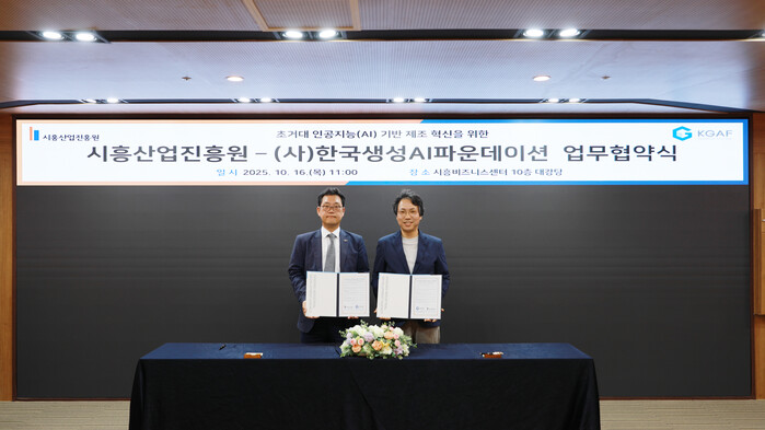 | ▲ 시흥산업진흥원-(사)한국생성AI파운데이션 업무협약 체결 /사진제공=시흥산업진흥원 |