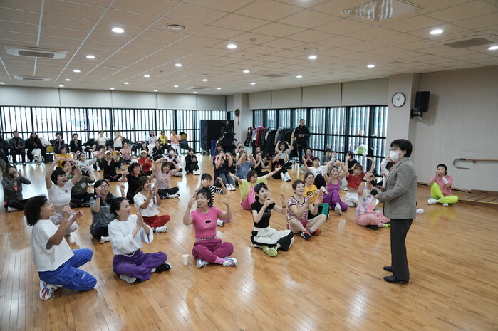 | ▲ 이순희 구청장이 삼양동 주민센터에서 에어로빅 강습을 받고 있는 구민들과 소통하고 있다. (사진=강북구청 제공) |