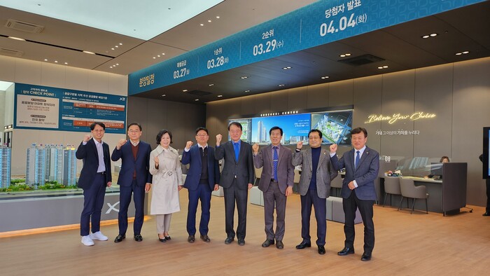 | ▲ 평택도시공사 임직원 및 시공사(GS컨소시엄)가 성공분양을 함께 응원하고 있다(평택도시공사 사장 강팔문[우측에서 4번째]) |