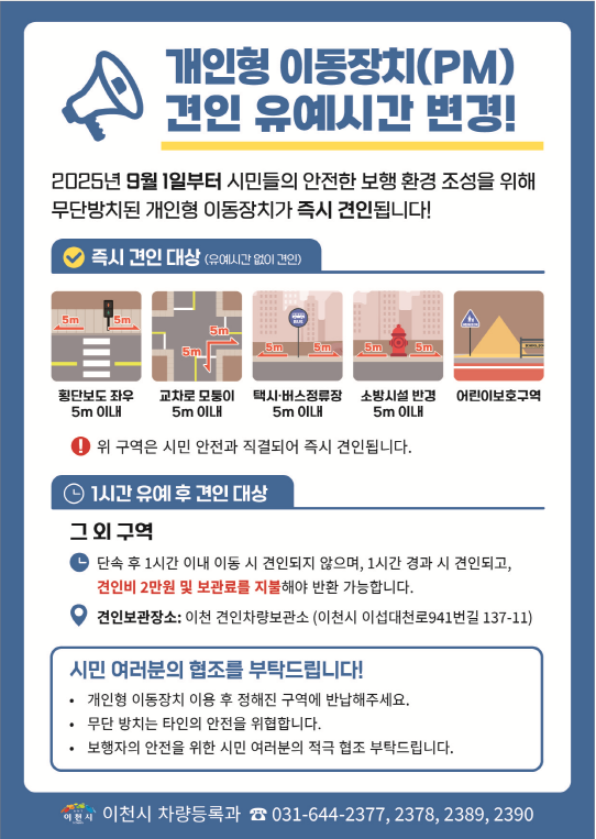 그러나 불법 주ㆍ정차된 개인형 이동장치로 불편을 겪는 민원이 지속 제기되는 상황에서 불편 민원을 더 빠르게 처리해달라는 시민들의 요구에 따라 신속하고 적극적으로 대응하기 위해 기존 1시간 유예 구역을 즉시 견인 구역으로, 2시간 유예 구역을 1시간 유예 구역으로 변경한다.