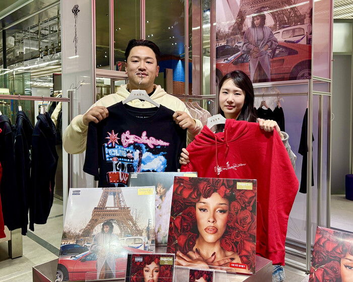 | ▲ 지난 7일 오전, 서울 영등포구에 위치한 더현대 서울 지하 2층 피어(PEER)에 마련된 미국 래퍼 '도자 캣'의 '마 비 월드투어(Ma Vie World Tour)' 팝업스토어에서 직원들이 굿즈를 소개하고 있다.(사진=현대백화점 제공) |