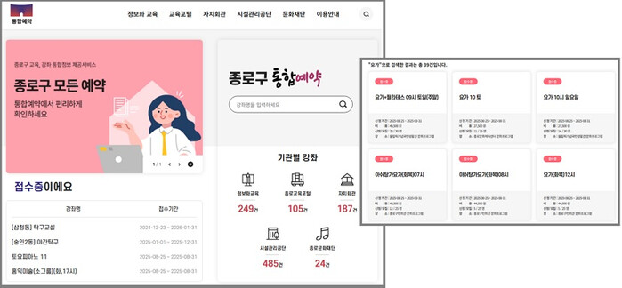 이로써 구민들은 구청 누리집 내 ‘통합예약’ 페이지에 접속해 정보화교육, 종로교육포털, 자치회관, 시설관리공단, 문화재단 등에서 운영하는 프로그램을 시간과 장소에 구애받지 않고 빠르게 확인하고 신청할 수 있다.