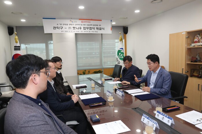 이날 관악구청에서 열린 협약식에는 박준희 구청장과 (주)펫나우 임준호 대표이사 등 양 기관의 주요 관계자들이 참석했다.