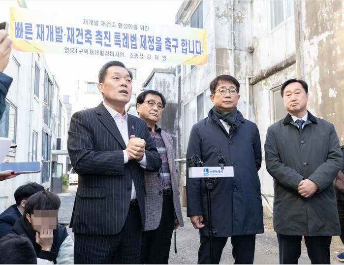 이재준 경기 수원시장과 박상우 국토교통부 장관이 지난 18일 영통1구역 재개발사업 현장을 방문해 정비사업 진행 상황을 점검했다. 이날 이 시장과 박 장관은 재개발 사업지인 매탄1동 태광빌라 일원(영통구 권광로276번길 71-7)을 둘러봤다. 사진은 이 시장(왼쪽), 박 장관(오른쪽 두 번째), 김준혁 의원(오른쪽 첫 번째) 등이 현장을 둘러보고 있는 모습. (사진=수원시청 제공)