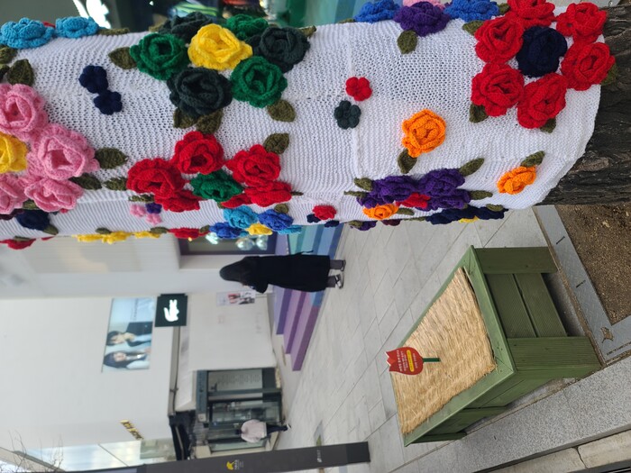 올해로 8회째를 맞은 ‘가로수길 트리아트 니팅’은 지역주민이 함께 참여하는 친환경 거리예술이다. 자원봉사자 등 139명이 ‘평화, 새로운 미래’라는 주제로 만든 뜨개작품을 은행나무 77그루에 설치했다. 내년 2월까지 전시한 작품은 이후 관내 경로당을 비롯해 필요한 곳에 기증할 예정이다.