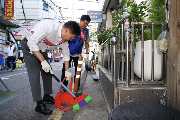 서울 종로구 창신1동이 최근 '함께 만드는 깨끗한 청계 풍경! 추석맞이 주민 합동 대청소’를 진행해 흥인지문을 중심으로 동대문역 일대, 청계천변에서 쓰레기 청소와 방역 활동을 했다. 사진은 정문헌 구청장(앞쪽)이 청소를 하고 있는 모습. (사진=종로구청 제공)