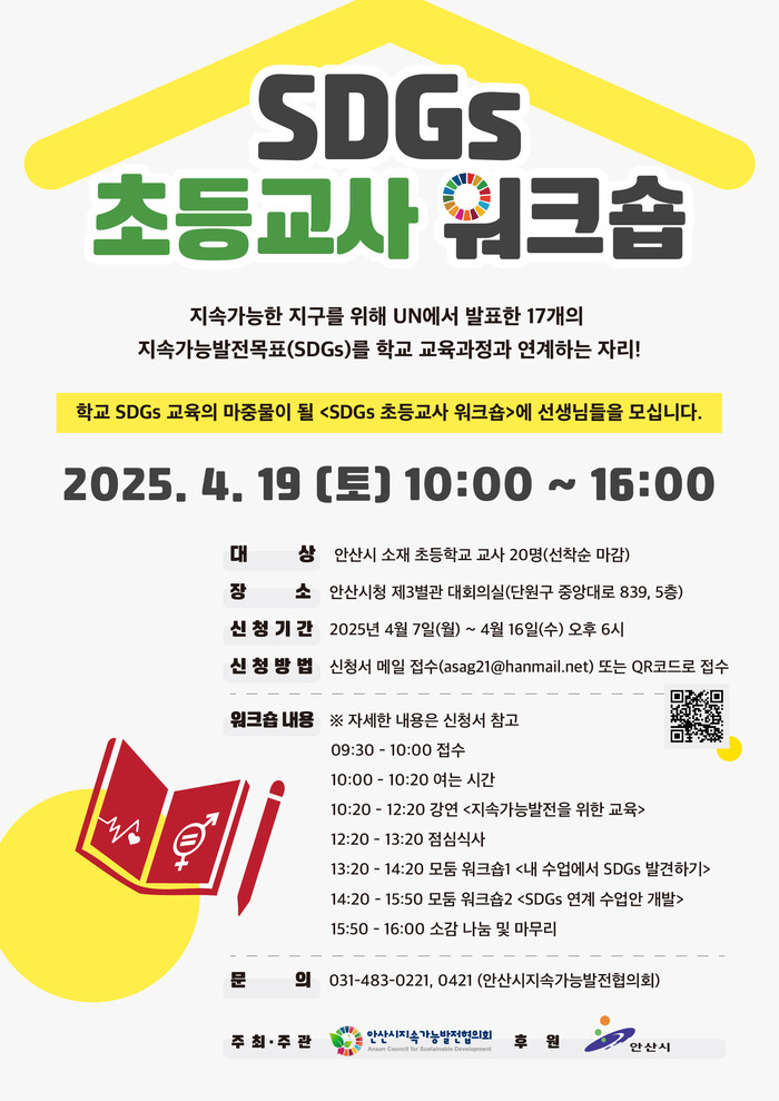 이번 워크숍에 참여를 원하는 교사들은 16일 오후 6시까지 안산시지속가능발전협의회 누리집에 게시된 신청서를 작성해 전자우편이나 홍보자료의 QR코드로 접수하면 된다. 자세한 사항은 안산시지속가능발전협의회로 문의하면 안내받을 수 있다.