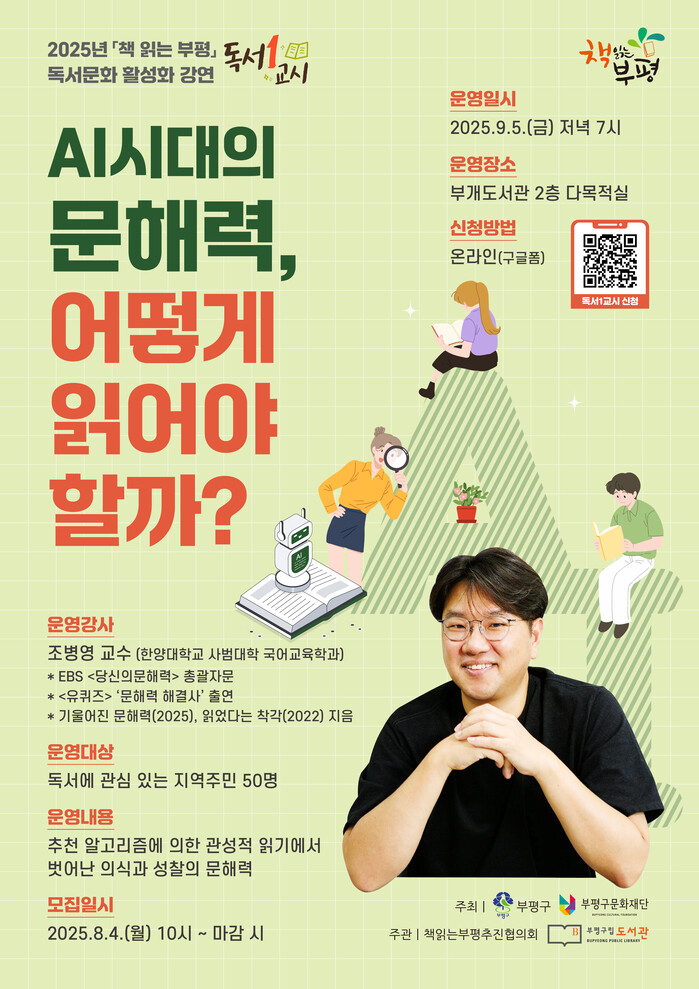 [인천=문찬식 기자] 인천 부평구(구청장 차준택) 부평구립도서관은 오는 9월 5일 부개도서관에서 2025년 ‘책 읽는 부평’ 독서문화 활성화 강연 ‘독서1교시’를 개최한다.