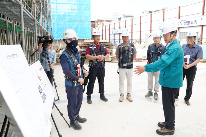 6일 김충범 경기 광주시 부시장이 최근 지속적인 폭염에 대응하기 위해 옛 청사부지 복합건축물과 고산지구문화누리센터의 폭염 대응 상황 등 폭염 대비 현장을 점검했다. 사진은 김 부시장(오른쪽)이 현장을 방문해 관계자의 설명을 듣고 있는 모습. (사진=광주시청 제공)