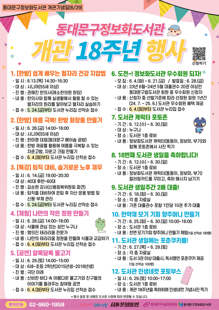 이번 행사는 프로그램별로 5월 24일(금)과 6월 4일(화)에 동대문구정보화도서관 누리집을 통해 선착순으로 접수 받으며, 개관 18주년 기념행사와 관련된 자세한 내용은 도서관 대표전화로 문의하면 된다.