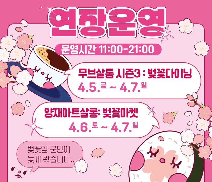 양재아트살롱 연장 운영에 맞춰 양재천길의 대표 음식들과 다양한 축제를 즐길수 있는 ‘무브살롱 시즌3: 벚꽃다이닝’도 4월 5~7일 연장 운영한다.