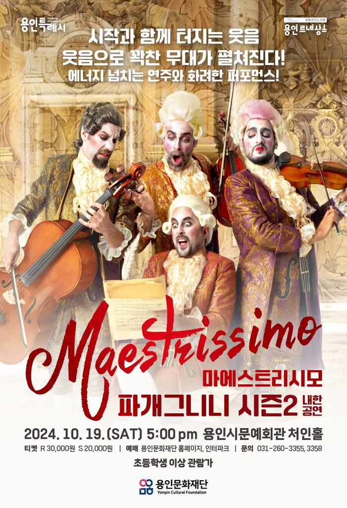 [용인=오왕석 기자] 용인문화재단(이사장 이상일)은 오는 10월 19일 용인시문예회관 처인홀에서 웃음과 재미가 있는 현악 4중주 그룹 ‘파개그니니(PaGAGnini)’의 시즌2 프로그램인 ‘마에스트리시모(Maestrissimo)’를 개최한다.