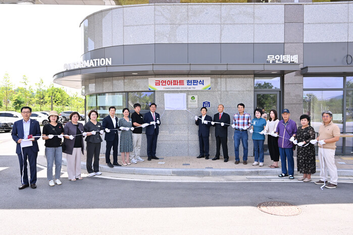 경기 양평군이 17일 양평 휴먼빌 리버파크어반 아파트를 양평군 제4호 금연 아파트로 지정하고 현판식을 했다. 사진은 이날 전진선 군수(가운데 왼쪽)가 관계자들과 함께 현판식을 진행하고 있는 모습. (사진=양평군청 제공)