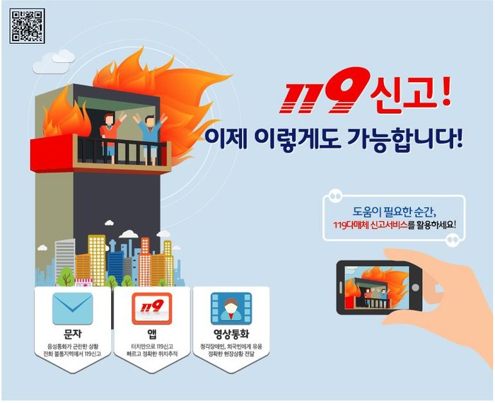 ‘119다매체 신고서비스’는 문자와 영상통화, 앱에 의한 신고가 가능해 외국인이나 청각장애인 등 의사소통이 어렵거나 음성통화가 곤란한 경우에도 긴급 상황을 전달할 수 있다.