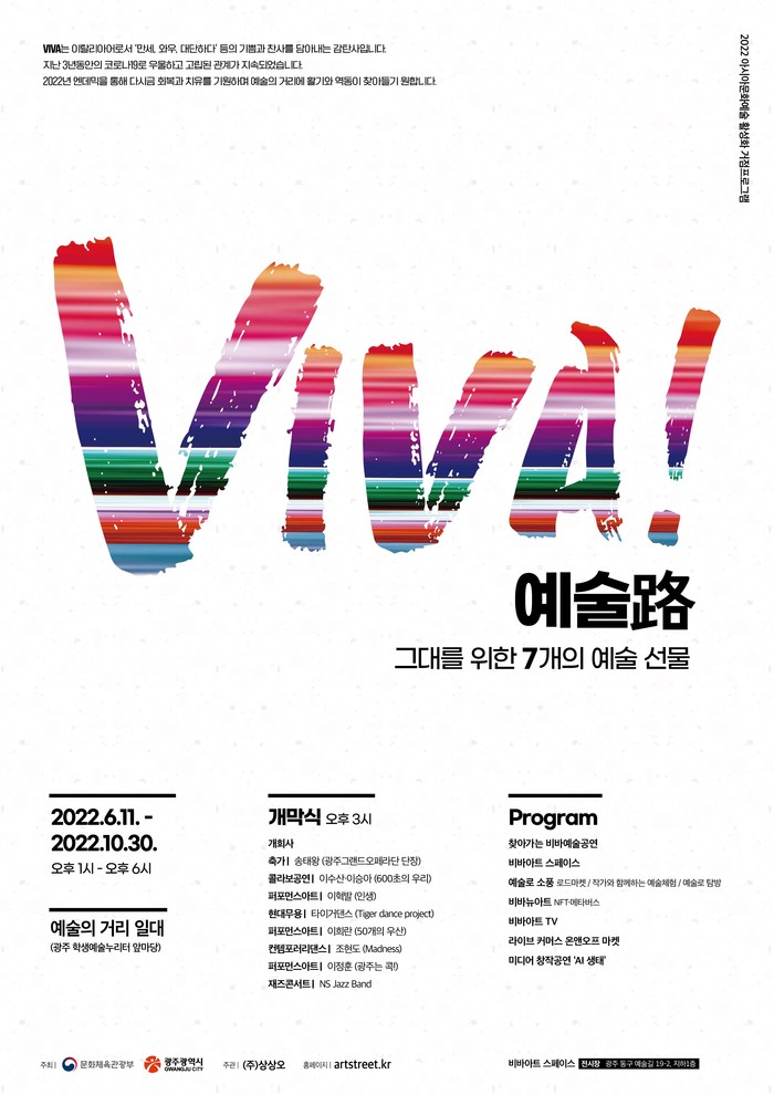 축제는 11일 개막식을 시작으로 20주에 걸쳐 ▲찾아가는 비바 예술 공연 ▲비바 뉴아트(NFT, 메타버스) ▲비바아트 스페이스 ▲예술로 소풍 ▲비바아트 TV ▲라이브 커머스 온앤오프 ▲미디어창작 공연 ‘인공지능(AI) 생태’ 등 7개 프로그램을 선보인다.
