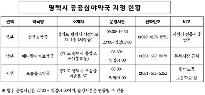 현재 평택시에서 운영하는 공공심야약국은 ▲메디칼세계로약국(통복동) ▲청북솔약국(서정동) ▲포승종로약국(포승읍) 등 3개소다.
