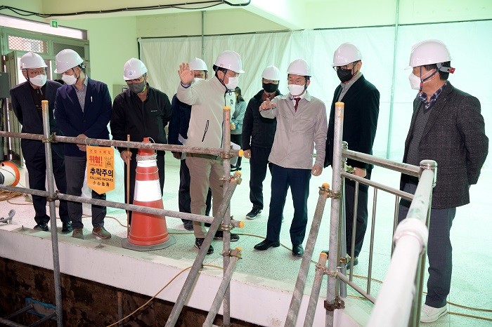 | ▲ 문영훈 광주광역시 행정부시장(우측부터 세 번째)이 21일 오후 상수도사업본부 덕남정수장을 방문해 정수장 시설 개량공사 현장을 점검하고 있다./광주광역시 제공 |