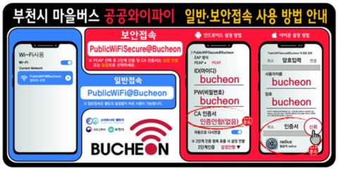 보안접속형(PublicWifiSecure@Bucheon)은 아이디와 패스워드 모두 'bucheon'을 입력하고 인증서 및 CA인증서는 '설정안함' 또는 '없음'으로 초기에 한 번만 지정해 놓으면, 앞으로도 모든 마을버스 뿐만 아니라 송내역(환승센터 포함), 부천 북부역 광장 등 부천시의 공공와이파이 서비스가 되는 지역에서도 자동 접속돼 편리하게 사용할 수 있다.
