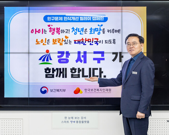 진교훈 강서구청장이 최근 ‘인구문제 인식개선’을 위한 릴레이 캠페인에 동참했다. 진 구청장은 구청 집무실에서 저출생과 고령화 문제 해결을 위한 사회적 인식이 높아져야 한다며 이를 위한 정부의 지원과 지자체의 역할을 강조했다. 사진은 진 구청장이 챌린지 참여 기념촬영을 하는 모습. (사진=강서구청 제공)