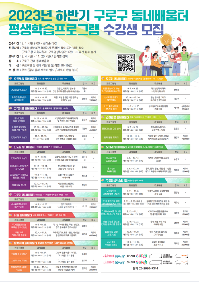 신청은 구로평생학습관(개봉동) 1관 및 구로구청 교육지원과에 방문하거나 구로평생학습관 홈페이지에서 할 수 있으며, 선착순 마감된다.