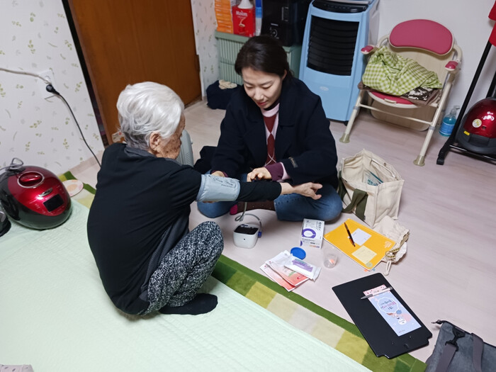 | ▲ 마을간호사가 어르신 댁을 방문에 건강 관리를 하고 있는 모습. (사진=성동구청 제공) |