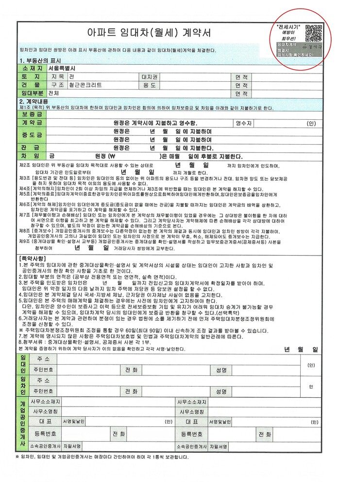 ‘부동산 안심QR계약서’는 전세사기 예방 및 대처방안에 대한 정보를 담은 QR코드가 찍힌 임대차 계약서로, 임대차 계약서에 QR코드를 기재해 임차인 스스로 임대차 계약 시 알아야 하는 중요사항을 손쉽게 확인할 수 있도록 했다.