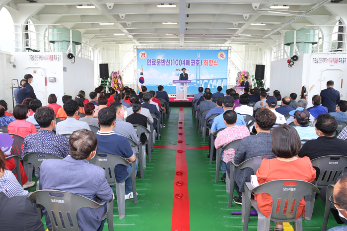 [신안=황승순 기자]전국 최초로 공영제 여객선을 운항하고 있는 신안군이 이번에는 연료운반선“1004에코호”의 건조와 시험운항 등 모든 검사를 마치고 7월 11일 취항식을 가졌다.