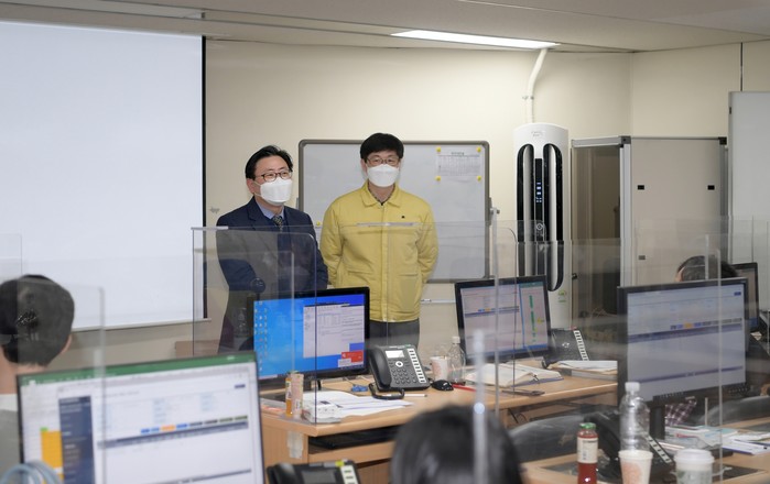 경기 오산시는 오미크론 변이의 확산에 따라 1개월간 중앙부처 공무원의 파견이 마무리돼 감사의 마음을 담아 격려의 시간을 보냈다. 시에 파견된 국세청 20명의 공무원은 한 달간 기초조사, 환자분류 및 배정 등의 업무를 수행했다. 사진은 격려식에서 김능식 부시장(왼쪽)이 감사의 마음을 전하고 있는 모습. (사진제공=오산시청)