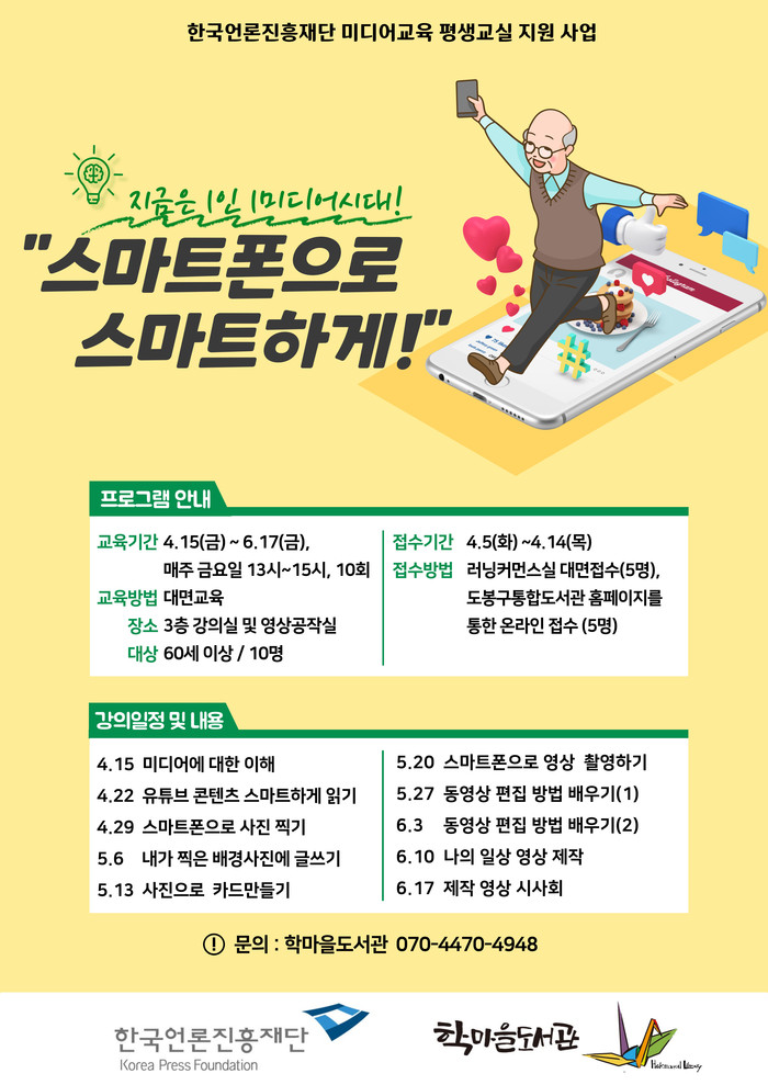 지원 자격은 60세 이상 노년층 10명으로 선착순 모집하며, 수강신청은 5일부터 ‘도봉구통합도서관 홈페이지’ 혹은 학마을도서관 4층 러닝커먼스 데스크에서 할 수 있다.